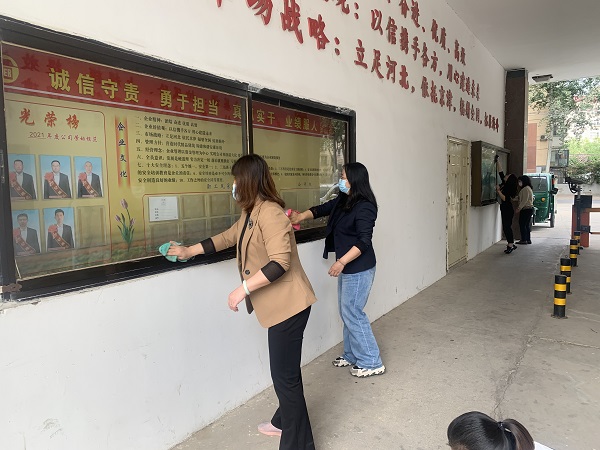 院內(nèi)整理清掃完畢后,大家又轉(zhuǎn)移陣地到辦公樓內(nèi),對辦公室、廁所、樓道等區(qū)域進行了打掃。黨員們充分發(fā)揚“甩開膀子、挑起擔子”的精神,擦拭玻璃、打掃地面、清理垃圾,全方位消毒噴殺,每一步都認真到位,不留死角。經(jīng)過近三個小時的辛勤勞動,院里綠化帶的枯枝、雜草得到了整治,機關(guān)大院內(nèi)更加整潔美觀,環(huán)境煥然一新。機關(guān)辦公室窗明幾凈、一塵不染,所有衛(wèi)生死角被徹底清理。大家擦擦汗水,露出會心的微笑。