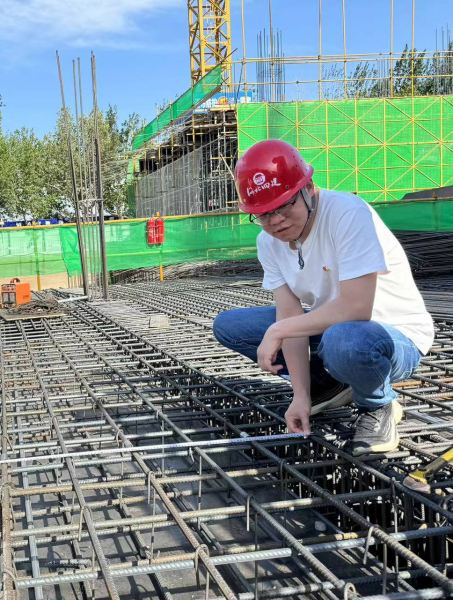 在搶抓進(jìn)度的同時,史驚濤深知質(zhì)量是項目的生命線。他帶領(lǐng)團(tuán)隊狠抓質(zhì)量控制,實現(xiàn)過程精品、一次成優(yōu),定期召開“質(zhì)量分析會+作業(yè)面交底會”,嚴(yán)控每一個環(huán)節(jié)、精研每一道工序,尤其是在地下室施工鋼筋綁扎階段,鋼筋間距密、數(shù)量多,柱插筋、集水坑鋼筋要求位置精確,施工難度較大,他認(rèn)真分析質(zhì)量控制重點和難點,進(jìn)行專項攻關(guān),結(jié)合現(xiàn)場實際情況反復(fù)推敲施工方案,按照圖紙設(shè)計間距,在基礎(chǔ)墊層上彈好鋼筋位置線,綁扎時嚴(yán)格按照位置線進(jìn)行柱插筋及集水坑鋼筋的放置及綁扎,墻筋采用水平和豎向定位筋,確保綁扎牢固,間距均勻,縱橫成線。