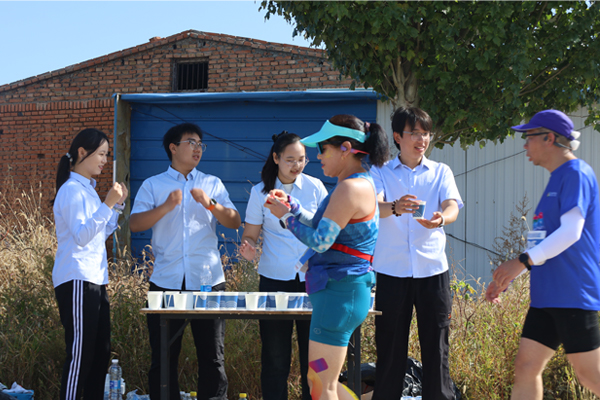 賽道上,秩序維護(hù)組的志愿者們化身“最熱情的指引者”??吹竭x手因路線不熟悉放慢腳步,立刻快步上前微笑指引,同時(shí)大聲喊出“加油!前方500米補(bǔ)給站”;遇到年長選手體力不支,主動(dòng)遞上溫水,輕聲叮囑“調(diào)整呼吸,堅(jiān)持就是勝利”。補(bǔ)給站內(nèi),志愿者們更是以“秒級響應(yīng)”服務(wù)每一位選手。左手遞水杯、右手遞紙巾,動(dòng)作連貫嫻熟,還不忘根據(jù)選手狀態(tài)送上鼓勵(lì):“您跑得真棒,加油!”一句句溫暖的話語、一個(gè)個(gè)有力的手勢,讓選手們瞬間充滿力量?!奥牭街驹刚吆啊佑汀哪且豢?,感覺腿上又有了勁,他們比我還在意我的成績,特別感動(dòng)?!币幻状螀⒓玉R拉松的年輕選手笑著說。