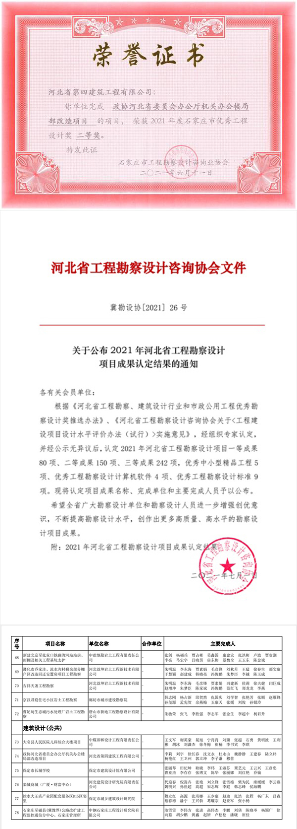 7月5日,公司設計院收到榮譽證書和文件,《政協(xié)河北省委員會辦公廳機關辦公樓局部改造項目》獲2021年石家莊市優(yōu)秀工程設計獎二等獎、河北省工程勘察設計項目成果獎三等獎。