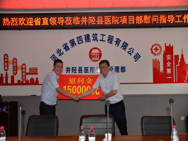 7月26日下午,河北省直工委副書(shū)記范金龍一行到二分公司井陘縣醫(yī)院項(xiàng)目部,對(duì)奮戰(zhàn)在一線的職工進(jìn)行暑期慰問(wèn),為他們送來(lái)了慰問(wèn)金和慰問(wèn)品。集團(tuán)工會(huì)主席王文利、公司黨委副書(shū)記、紀(jì)委書(shū)記、工會(huì)主席李懷生、二分公司黨總支書(shū)記孫立鋒一同參加。