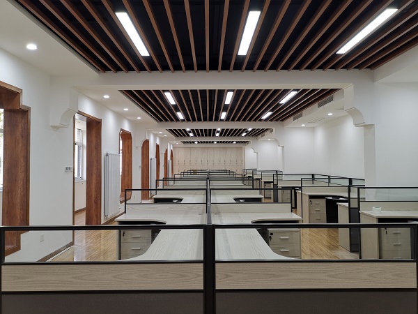 在該項目的裝飾設(shè)計中,設(shè)計院充分利用原建筑條件,在盡可能節(jié)約裝修成本的基礎(chǔ)上,將辦公環(huán)境打造成為簡約優(yōu)雅、別具一格的空間。改造區(qū)域原為多個小型辦公室,并且處于院落的南面,采光極差。設(shè)計師經(jīng)過與領(lǐng)導(dǎo)協(xié)商,除保留個別房間外,將剩余的幾個辦公室隔墻拆除,從而獲得了一個大而開敞的辦公區(qū),可容納36個寬敞工位,并取消此辦公區(qū)域所有的門,且將原窗戶臺面降低至距地40厘米高,最大可能的利用了自然采光。色調(diào)的選擇上,墻面大面積采用白色乳膠漆與硅藻泥,一定程度上也彌補了自然采光的不足。