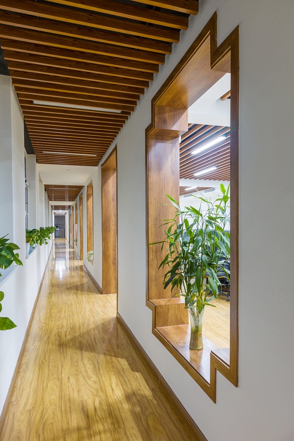 由于辦公區(qū)裸露門洞窗洞較多,極具藝術(shù)感,于是在設(shè)計風格方面設(shè)計師借鑒了中式古典花窗元素,將四個窗洞設(shè)計為不同造型,曲直轉(zhuǎn)折均一絲不茍,淋漓盡致地展現(xiàn)出中式古典花窗的特點,使得簡潔的空間多了一絲東方韻味。這樣舒適雅致的辦公環(huán)境更能激發(fā)設(shè)計師的創(chuàng)作靈感,讓設(shè)計師創(chuàng)作出更好的設(shè)計作品。