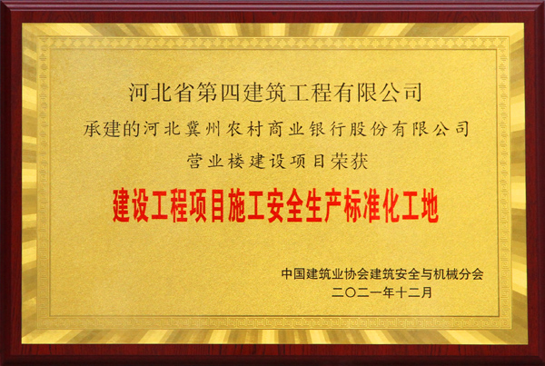 2021年12月22日,公司收到中國建筑業(yè)協(xié)會安全與機械分會下發(fā)的文件,我公司施工的河北冀州農(nóng)村商業(yè)銀行股份有限公司營業(yè)樓建設(shè)項目喜獲全國安全生產(chǎn)標準化工地,這是公司第9次獲得此項榮譽。