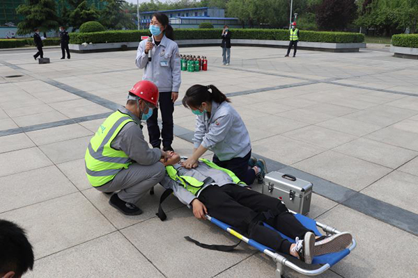 上午10點,消防救援支隊講解員對全體人員進(jìn)行消防安全知識培訓(xùn),詳細(xì)講解了防煙面罩正確佩戴方法、疏散逃生要領(lǐng),以及滅火器的使用方法和注意事項。10點半左右,演練正式開始,施工現(xiàn)場三區(qū)二層濃煙滾滾,“著火了,著火了¨¨¨”項目安全員在現(xiàn)場巡查時發(fā)現(xiàn)火情高聲呼喊,周圍施工人員迅速拿滅火器進(jìn)行滅火,項目經(jīng)理張玉賓接到險情后馬上通知義務(wù)消防隊員滅火并組織緊急疏散。大家用濕毛巾捂住口鼻,俯身低頭按照演練逃生路線快速從現(xiàn)場撤離到演練集合區(qū)。在大家撤離火災(zāi)現(xiàn)場的同時,救援組孫杰、楊克、董擁軍等人把傷員抬到通風(fēng)處,他們在醫(yī)療救護(hù)組的指導(dǎo)下,用雙手拍打傷者雙肩并呼叫他的名字、用觸摸頸動脈等方法斷傷者是否喪失意識,并進(jìn)行心肺復(fù)蘇。心肺復(fù)蘇演練時,按壓胸部是最有效也是最常用的辦法,施救人員首先在傷者兩乳頭連線中間,胸骨中下三分之一處找準(zhǔn)按壓點,然后用手掌根部緊貼傷者胸部,兩手重疊,五指相扣,手指翹起,肘關(guān)節(jié)伸直,用上身重量垂直下壓30次,經(jīng)過救治傷者最終蘇醒,整個搶救過程有條不紊,最后藁城區(qū)消防救援大隊長張海寧對應(yīng)急預(yù)案演練進(jìn)行了點評,此次火災(zāi)應(yīng)急預(yù)案演練圓滿結(jié)束。